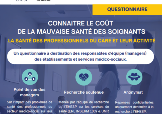 L'étude VALORIS, menée par l'EHESP, s'intéresse au coût de la mauvaise santé des professionnels santé et du médico-social. Le volet médico-social est ouvert à la participation jusqu'en mars 2026